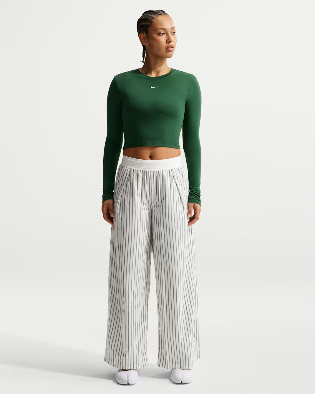 Women's loose, mid-rise, and lightweight woven striped pants.